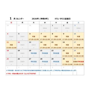 1/20~2/28までの間は冬季営業期間です。毎年冬休みをいただいておりましたが、今年は週末「金曜日と土曜日のみ」の営業とさせていただきます。火~木は前日までにご予約をいただいた場合のみ営業いたしますが、ご予約がない場合はお休みとなります。大変恐れ入りますが、何卒よろしくお願い申し上げます。